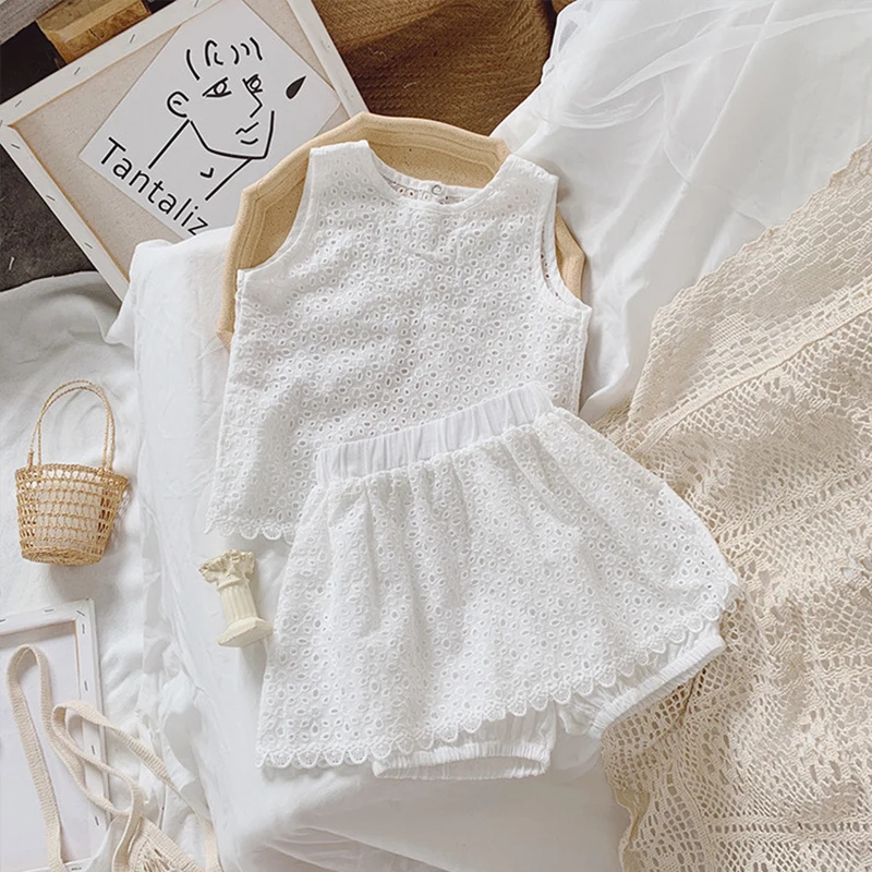 Girls 2021 Summer Clothing Sets Hollow Lace Suit Baby Casual Sleeveless T-shirt +Shorts Kids Clothing Sets Baby Clothes Outfits