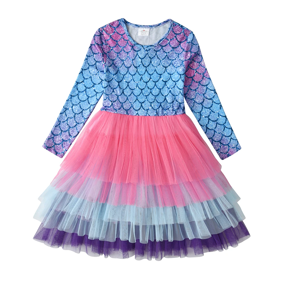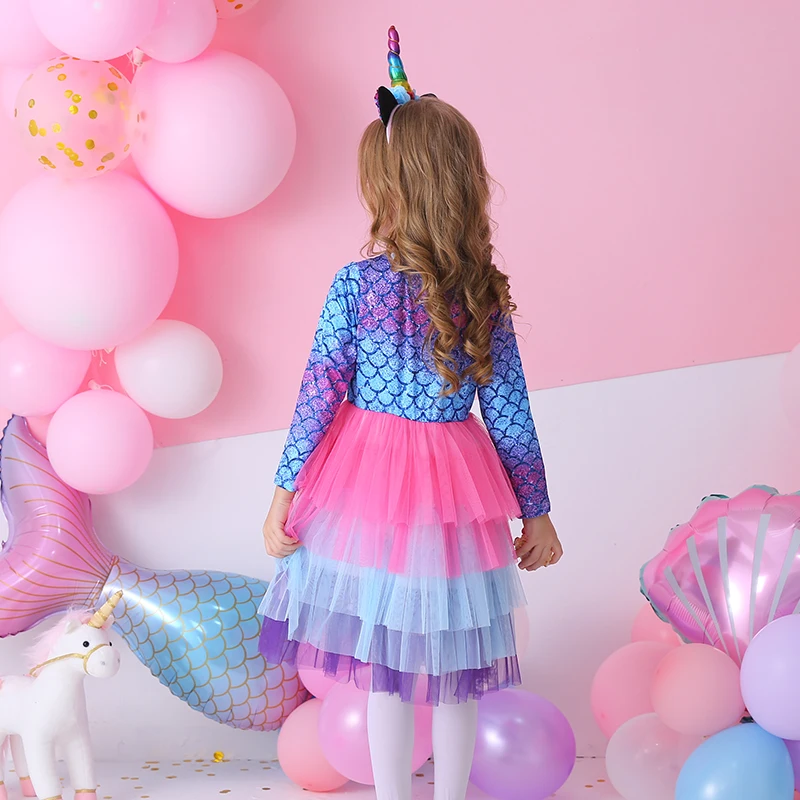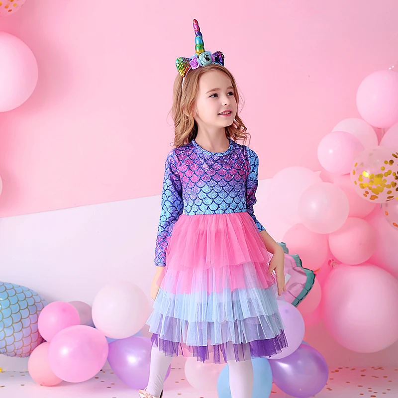 VIKITA Kids Tutu Dress for Girls Long Sleeve Party Prom Vestidos Toddlers Mermaid Unicorn Dresses Kids Princess Autumn Dress
